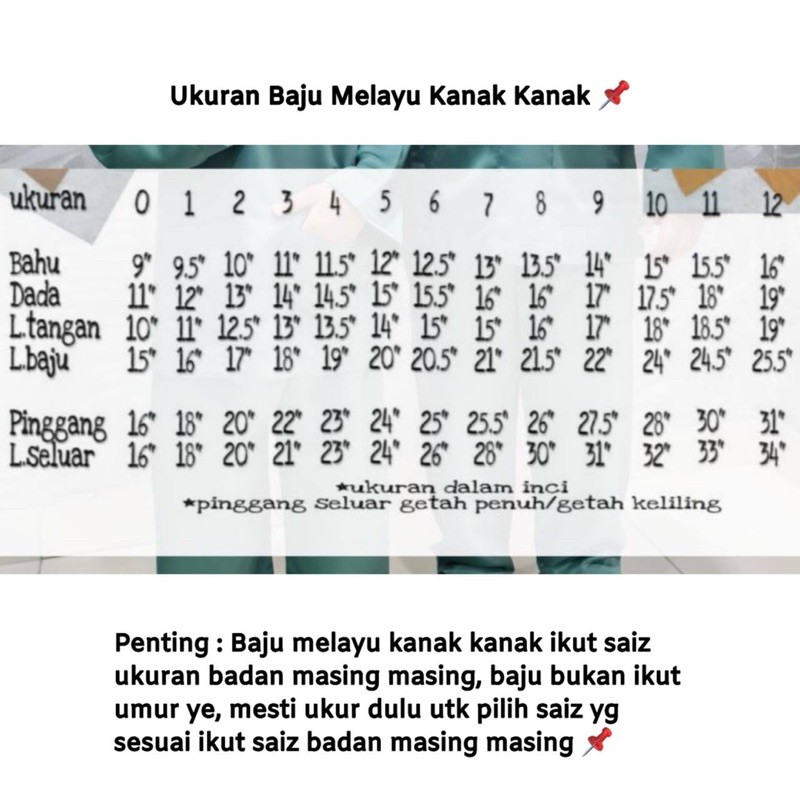 Sila rujuk ukuran secara am yang diberikan bagi menentukan kesesuaian saiz ukuran baju budak. Labuh tangan, 11, 12 ;